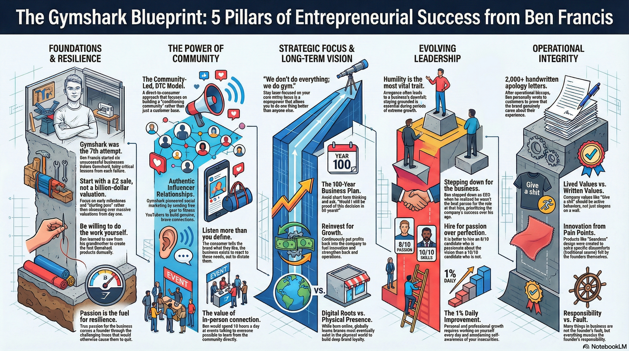 Ben Francis, the founder of Gymshark, transformed a garage-based screen-printing operation into a global fitness empire worth billions. His journey is defined by a relentless commitment to community, a deep-seated humility, and the courage to evolve alongside his brand. The following lessons explore his philosophy on failure, leadership, and the power of long-term thinking.