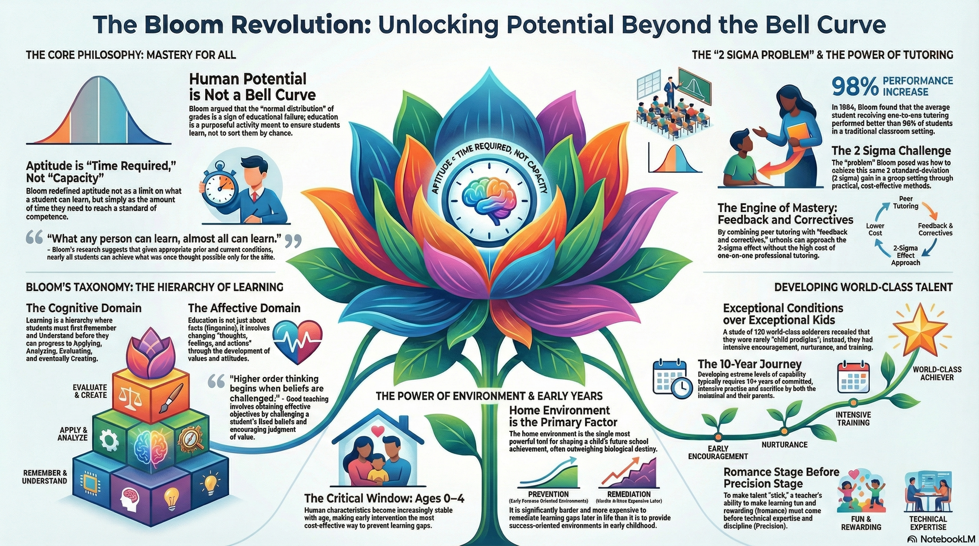 The following list details significant quotes and key learnings from the work of educational psychologist Benjamin S. Bloom. These are categorized by his major contributions: Mastery Learning, Talent Development, The 2 Sigma Problem, and Educational Philosophy.