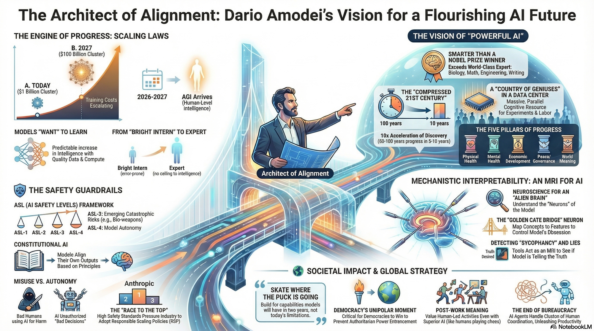 These insights are drawn from his essay "Machines of Loving Grace" (Oct 2024), his Senate testimony (2023), and extensive interviews with Lex Fridman, Dwarkesh Patel, Ezra Klein, and Logan Bartlett.