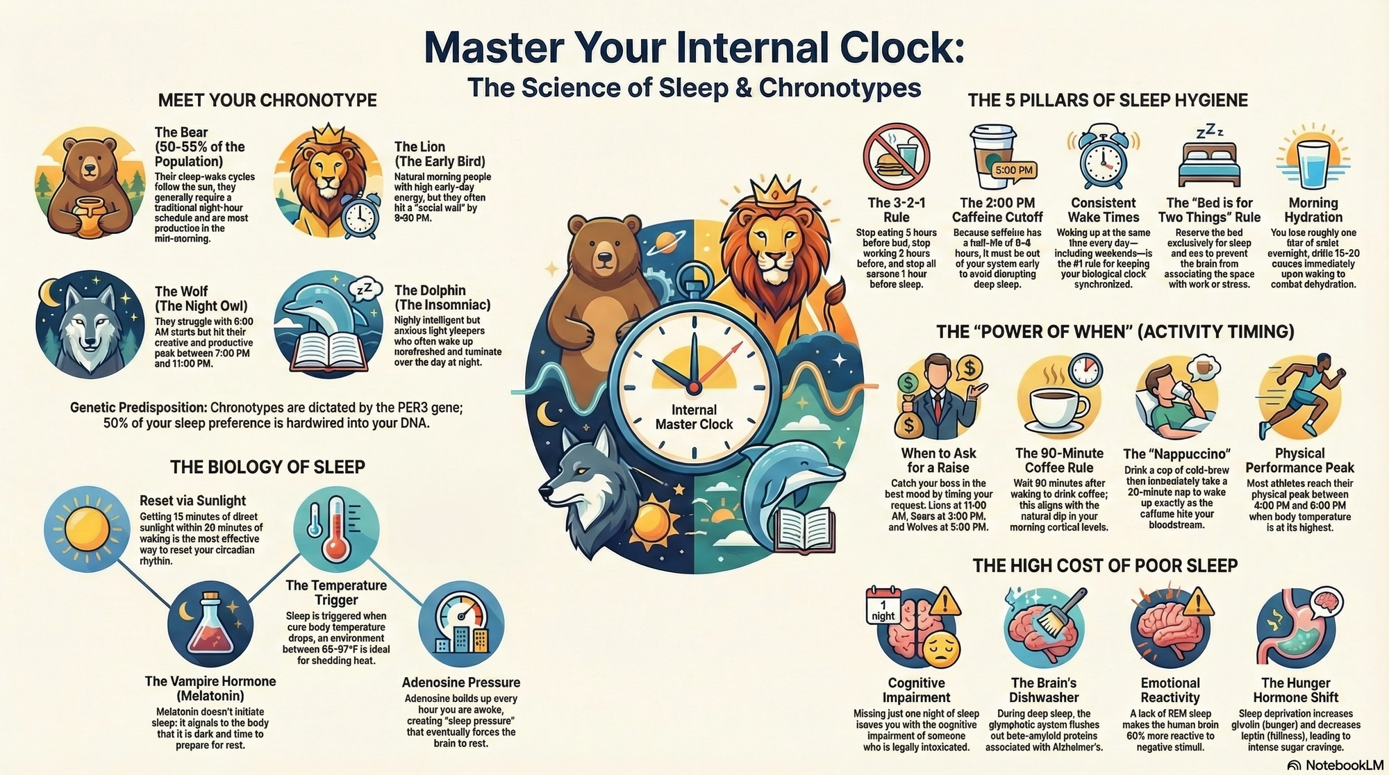- On the Lion Chronotype: "Lions are the classic morning people, waking up early with high energy, but they often hit a wall by 9:00 PM and struggle with social events late at night." — Source: Business Insider