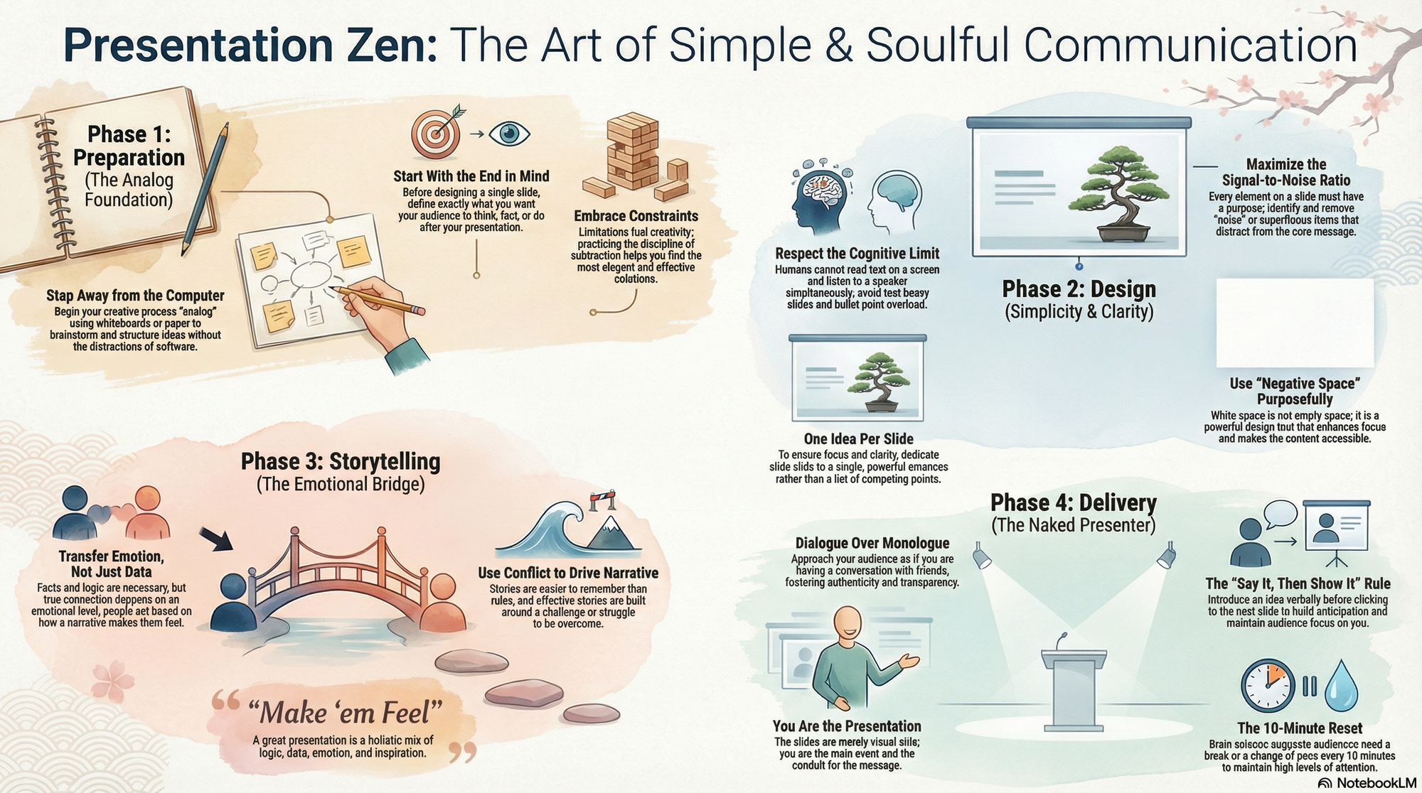- "Restraint in preparation, simplicity in design, and naturalness in delivery." - These are the three core pillars of the Presentation Zen philosophy.[3]
