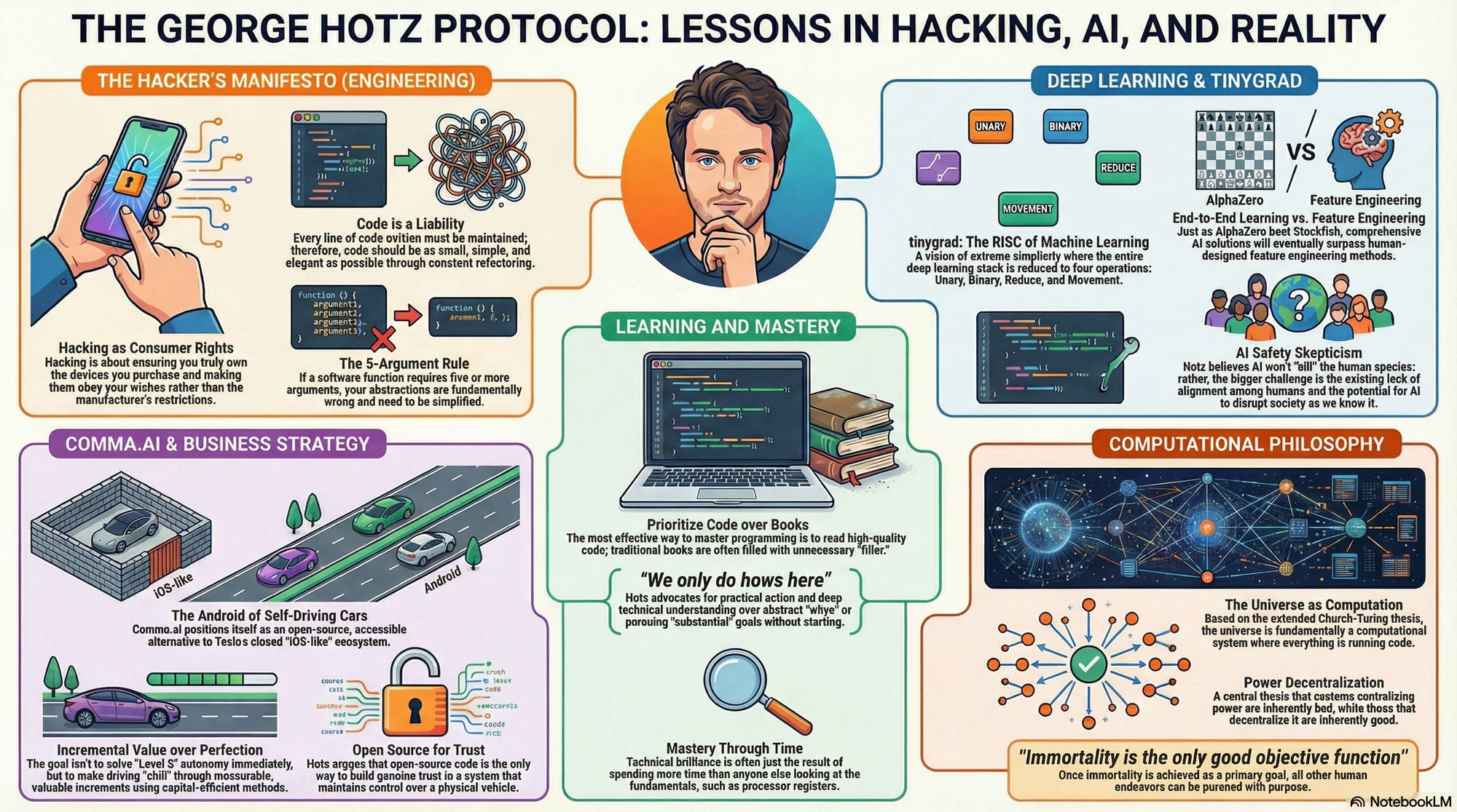 George Hotz, the hacker known as geohot, has transitioned from breaking consumer electronics to building the future of autonomous vehicles and artificial intelligence. His philosophy emphasizes radical simplicity, the decentralization of power, and a deep-seated belief that the universe is fundamentally computational.