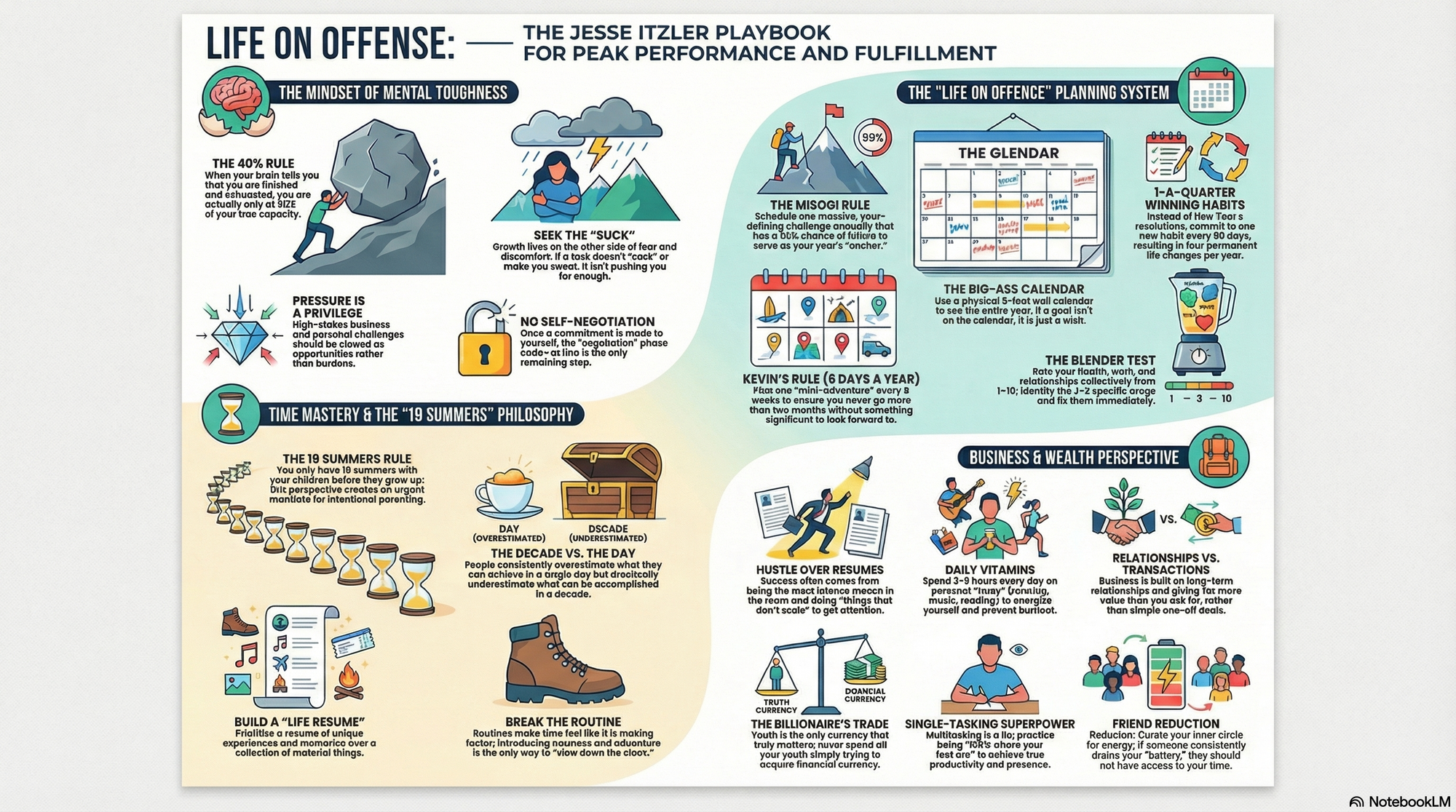 - "Play Life on Offense:" "Most people play life on defense—reacting to emails, meetings, and other people's requests. Put your big goals on the calendar first, then let the world fit in around them."