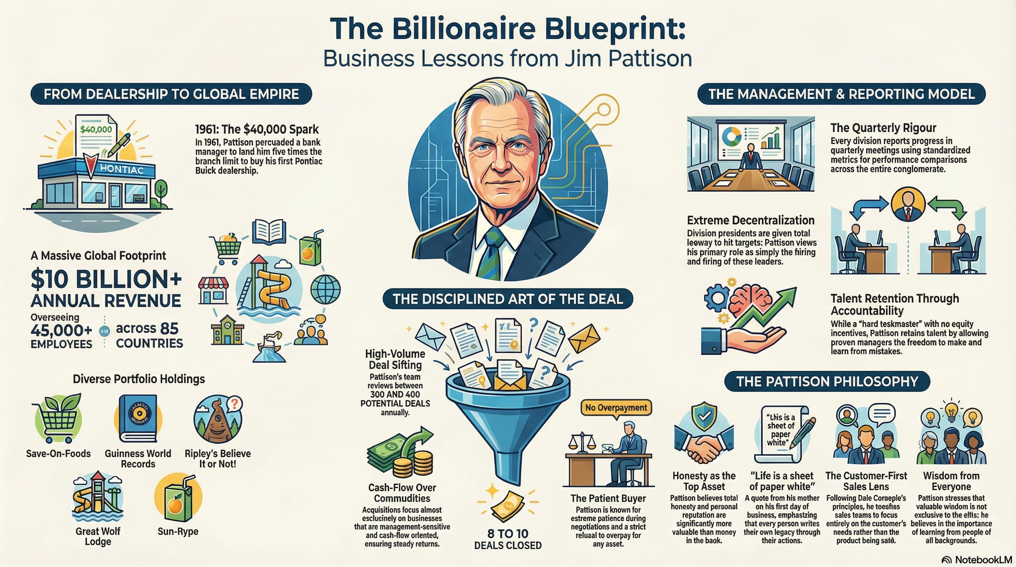 Pattison started from humble beginnings, born during the Great Depression and his family moving in Vancouver when he was 6. He bought his first Pontiac Buick dealership with a $40,000 Royal Bank of Canada loan after persuading the local manager to exceed the branch's lending limit fivefold. Dubbed the Warren Buffett of Canada, he built that dealership into a global business empire over the next five decades, completing hundred of acquisitions to create one of Canada's largest private companies.