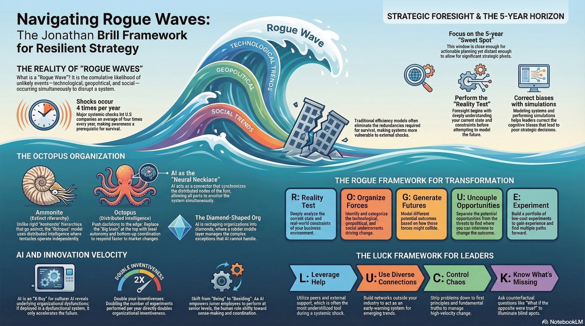 - On The ROGUE Framework: "Transforming systemic threats into opportunities requires five steps: Reality test, Organize forces, Generate futures, Uncouple opportunities, and Experiment." — Source: YouExec - Rogue Waves Summary