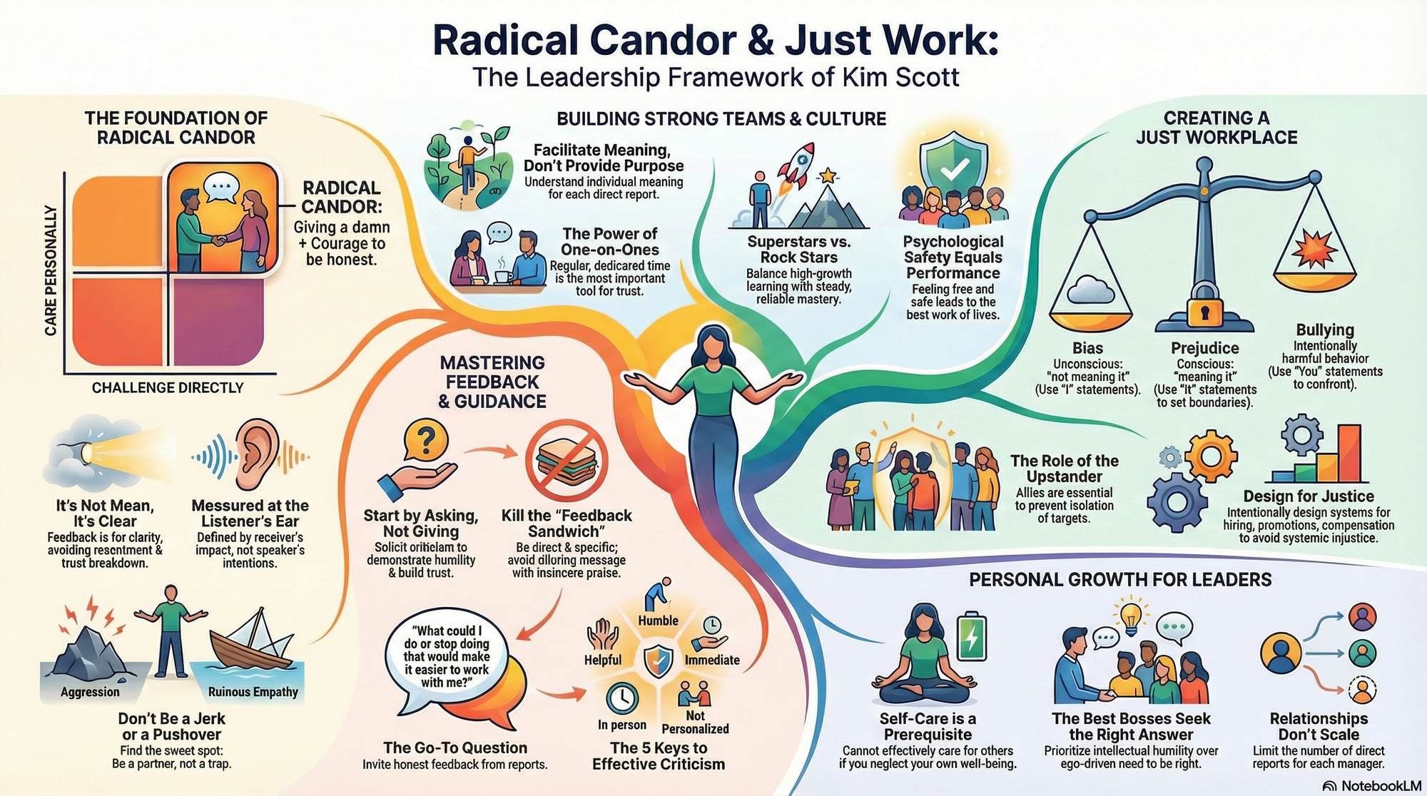 - "The feedback sandwich—opening and closing with praise, sticking some criticism in between—is a terrible idea." Scott advises against this common technique, arguing it feels insincere and dilutes the message.[3]