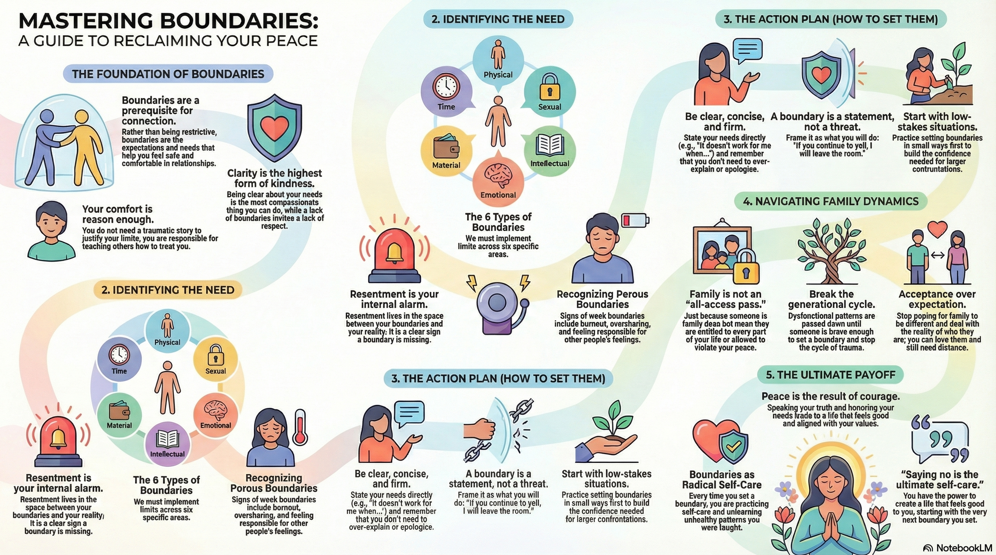 - "There are six types of boundaries: physical, sexual, intellectual, emotional, material, and time." Recognizing these categories helps identify where we need to implement limits.