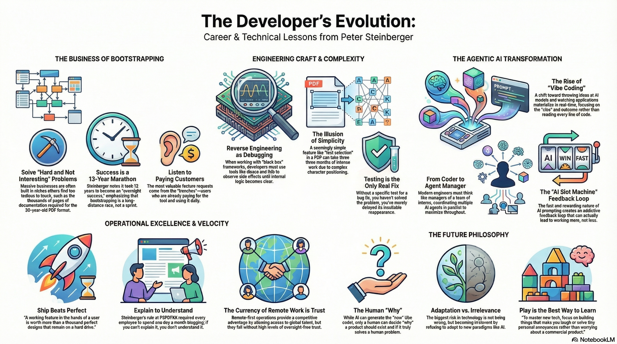 - On Selling a Business: "Selling my shares in PSPDFKit wasn't just a financial decision; it was about acknowledging when the 'building' phase had turned into a 'managing' phase that no longer fueled my passion." — Source: steipete.me