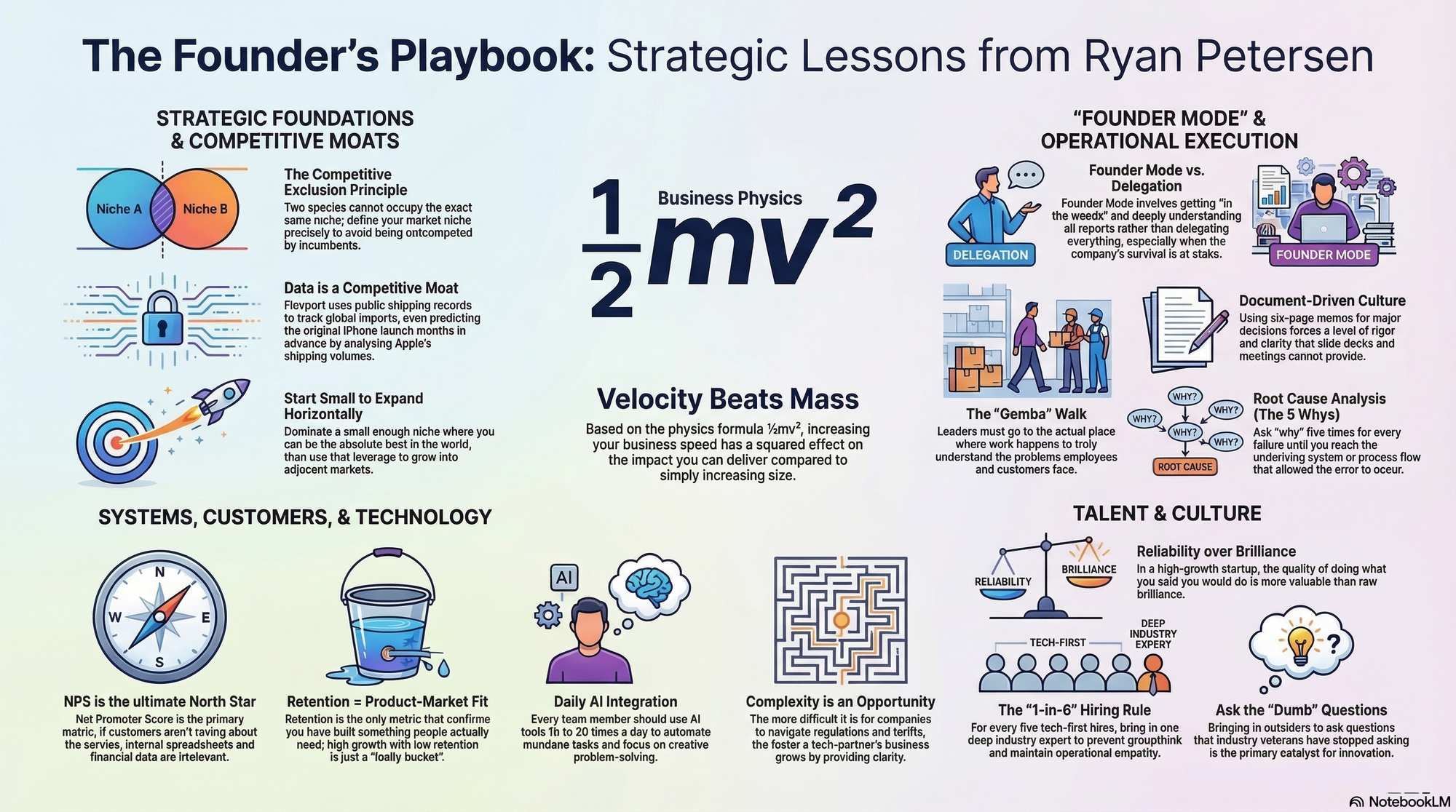 - On Niche Dominance: "Start in a small enough niche where you can be the absolute best in the world, then use that leverage to expand horizontally." — [Source: Wave.co Interview] (https://www.wave.co/blog/ryan-petersen-flexport)