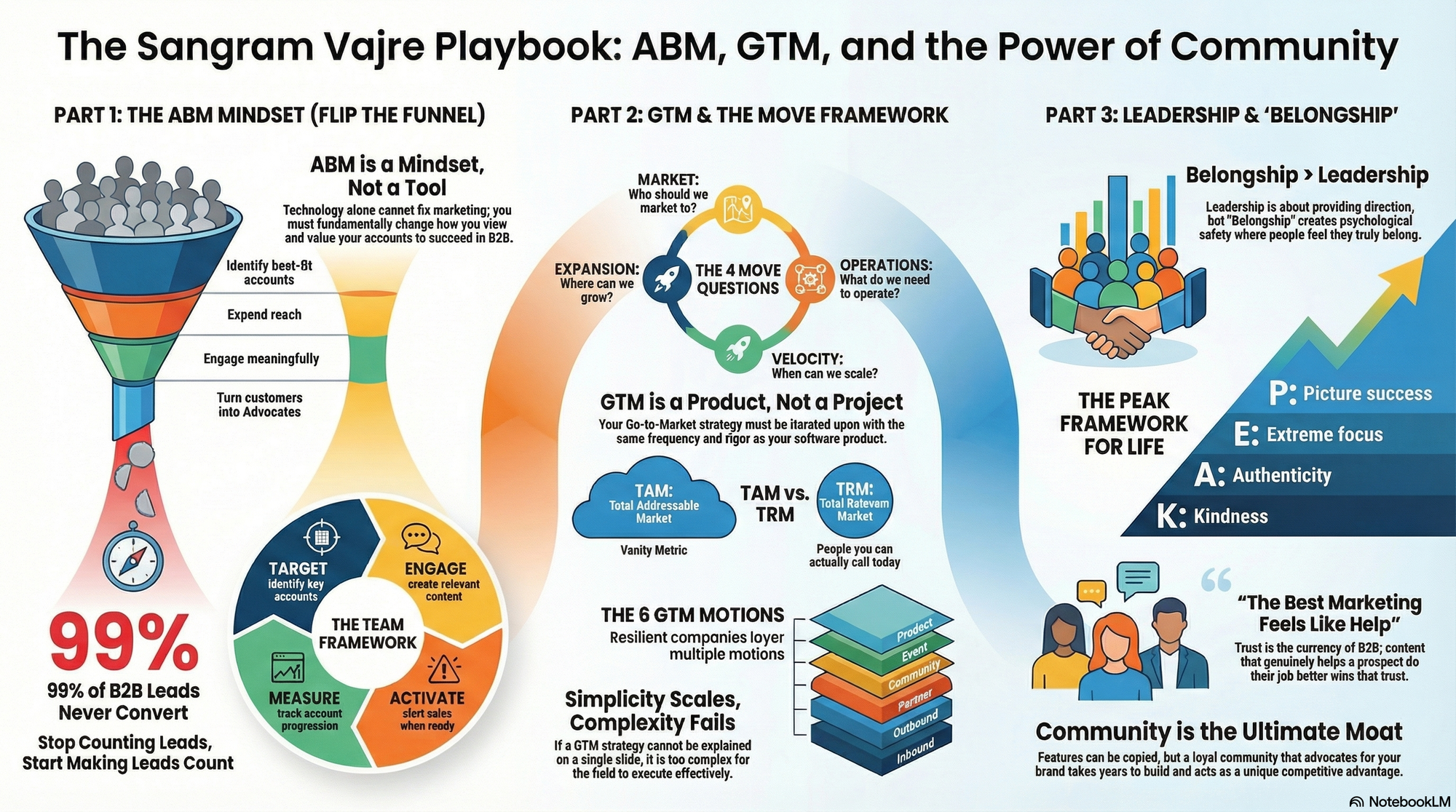 Learnings from Sangram Vajre, categorized by his major frameworks (ABM, GTM) and his philosophy on leadership.