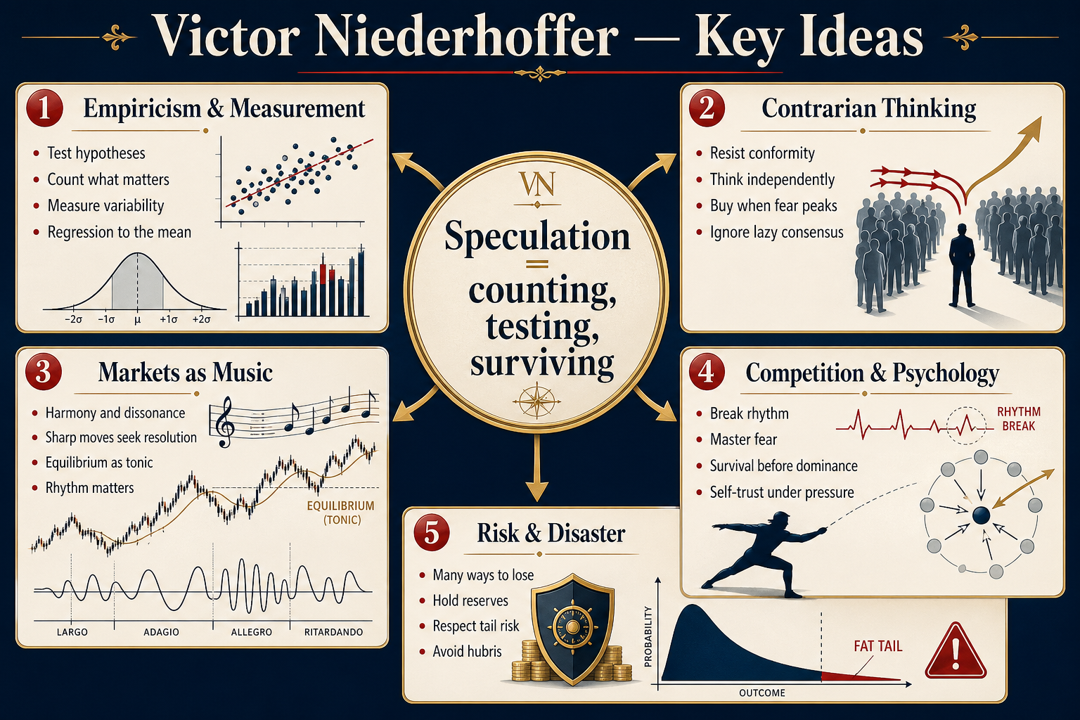 Victor Niederhoffer is a legendary hedge fund manager, former world-class squash champion, and pioneer of statistical arbitrage who approaches the financial markets as a grand, interconnected ecosystem. Drawing inspiration from fields as diverse as classical music, board games, and biological empiricism, his philosophies fiercely challenge conventional wisdom. The following insights capture his relentless pursuit of truth through data, his deep respect for the hazards of speculation, and his lifelong quest to master the art of counting.