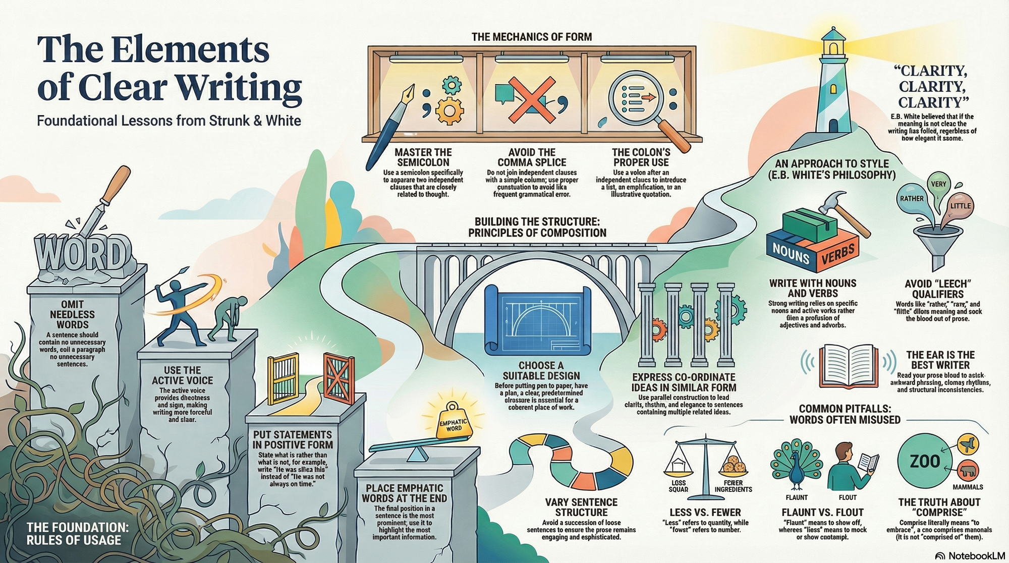 - "Omit needless words." (Repeated for emphasis) - The guiding principle for sentence structure and paragraph construction.